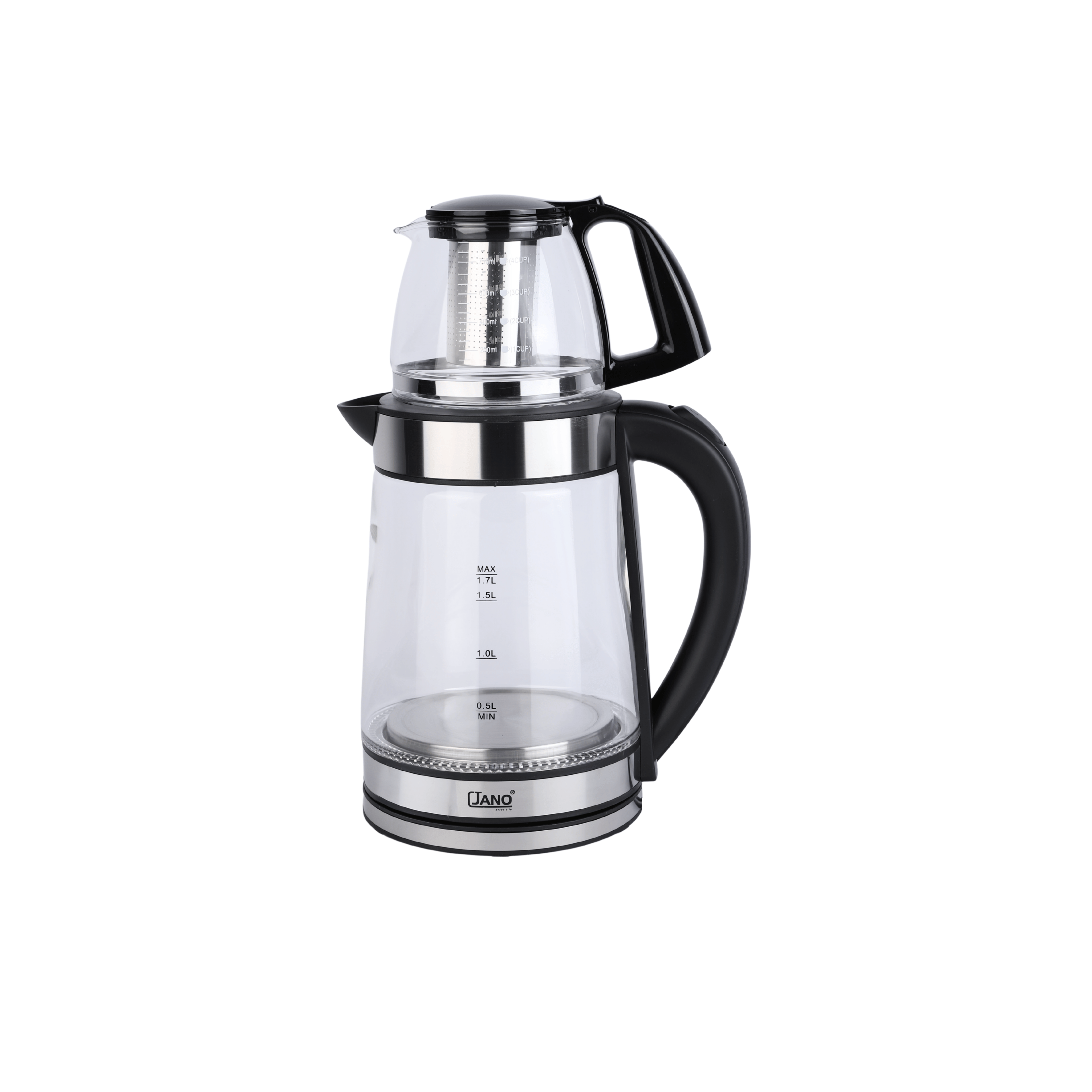 استمتعي بتحضير الشاي والماء بسرعة وأمان مع غلاية جانو الزجاجية المزدوجة بقدرة 1500 واط، تصميم زجاجي أنيق، وكفاءة تسخين مثالية، مع أمان تام، وميزة الإيقاف التلقائي الذكية.